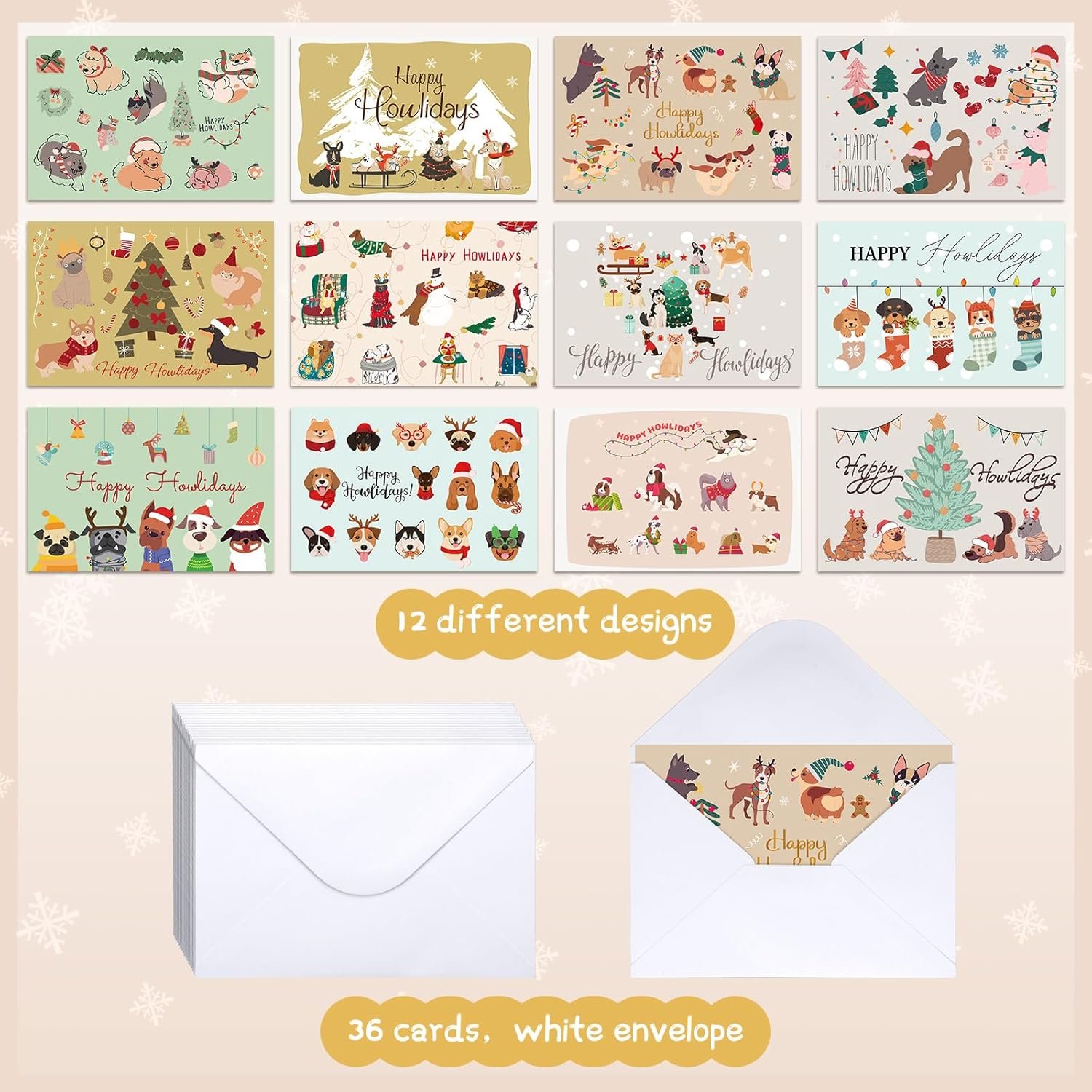 36 Pack Funny Dogs Christmas Cards Bulk Happy Holidays Greeting Cards Cute Dogs Xmas Blank Note Postcards with Envelopes, 12 Assorted Designs, 4 x 6 Inches