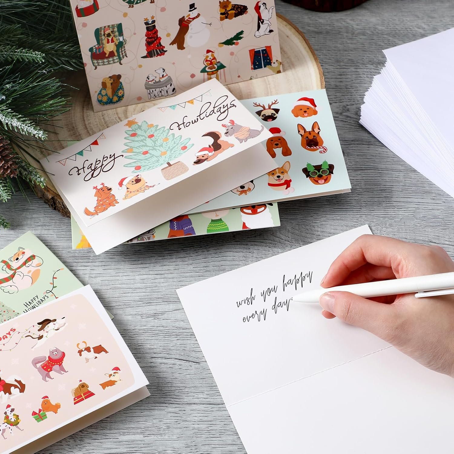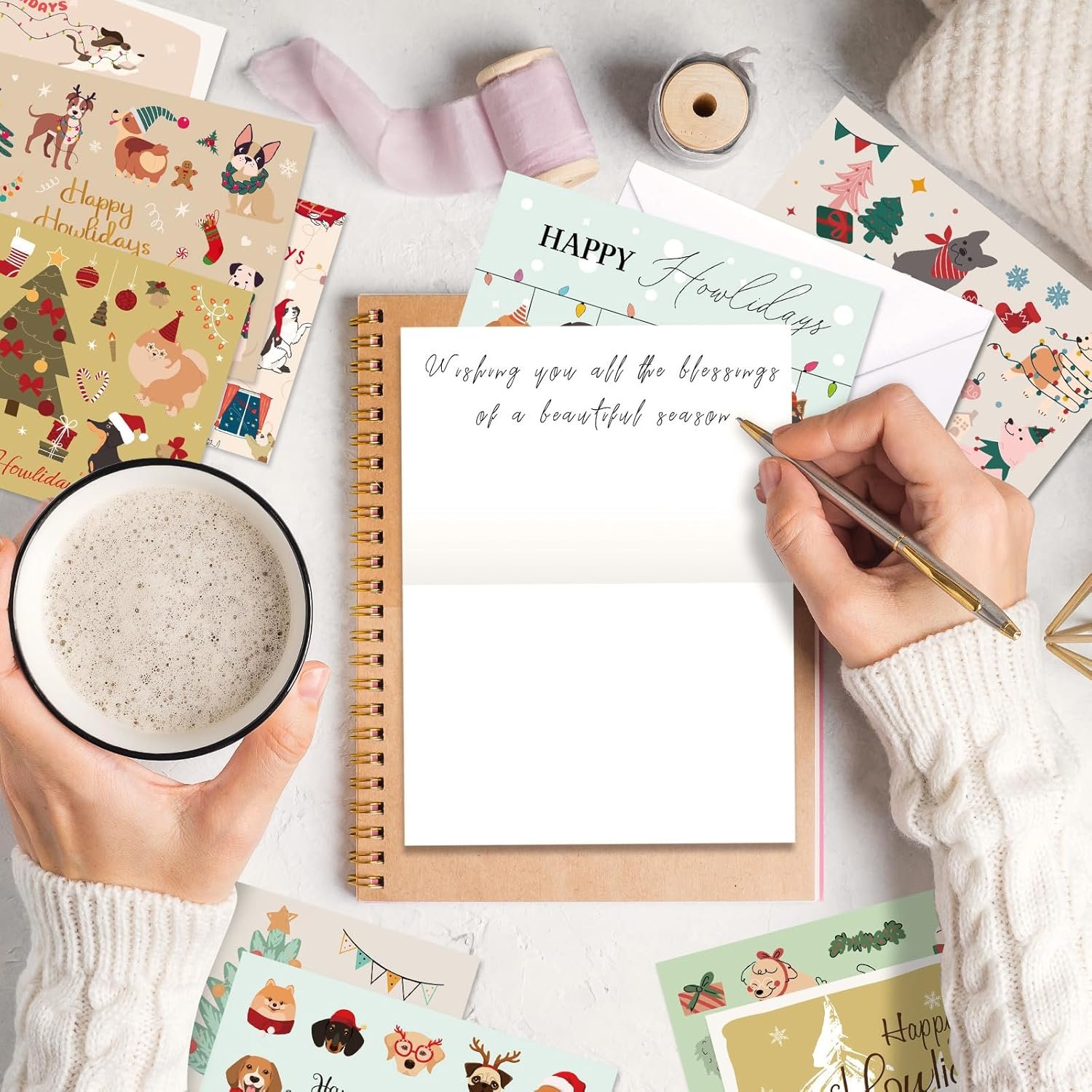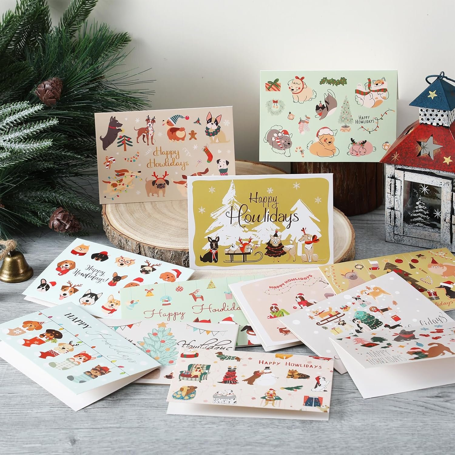 Cute Dog Design: featuring 12 different designs, these happy holidays greeting cards showcase adorable dogs in festive outfits, complete with Santa hats, scarves, and even reindeer antlers; Whether for men, women, kids, or fellow pet lovers, these Christmas cards add a dose of warm to holiday traditions