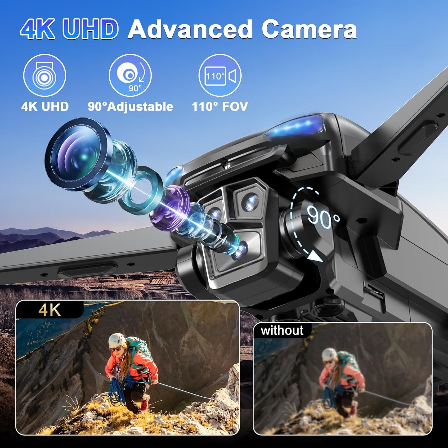4K HD Camera & 4.5-Inch LCD Remote Controller: Our drones with camera for adults 4k are equipped with a 90° adjustable lens, allowing you to capture from multiple angles with ease. The included LCD screen remote controller supports 5GHz real-time video transmission, enabling you to preview and record every exciting moment during flight. An SD card and card reader are included for easy storage and sharing of photos and videos.