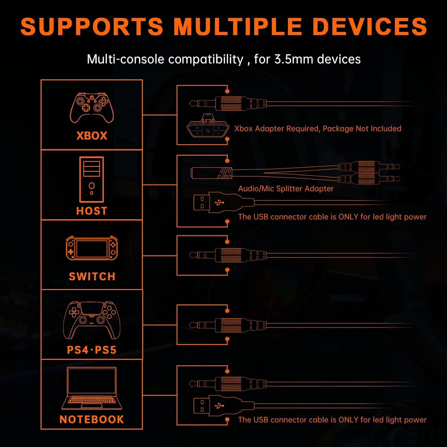 𝙉𝙤𝙩𝙚 3: When you use headset on your PC, make sure to connect the “1-to-2 3.5mm audio jack splitter cable” (Red-Mic, Green-Audio). ONLY When your devices have a USB port, the RGB lights can be lighting up. The USB connector cable is ONLY for led light power.
